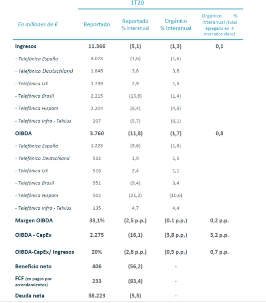 Por otra parte, la deuda financiera neta se sitúa en 38.223 millones de euros. Y como dato positivo, Telefónica confirma el dividendo anunciado para 2020 de 0,4 euros por acción.
