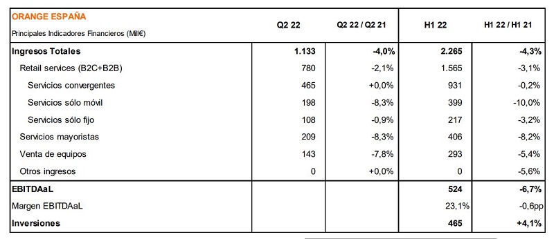 Orange España ha registrado unos ingresos de 2.265 millones de euros de enero a junio de 2022, lo que supone un 4,3% menos que en el mismo periodo del año anterior. Se estabiliza así la tendencia de recuperación de los ingresos totales de la compañía, tras el -5,1% en el mismo semestre de 2021.