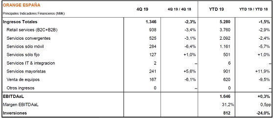 Orange España acaba de hacer públicos sus resultados anuales. La operadora ingresó durante el ejercicio 2019, 5.280 millones de euros, un 1,5% menos que el año anterior. Tal y como comenta la operadora la facturación por servicios “retail”, tanto B2C como B2B (que incluye servicios convergentes, solo fijo, solo móvil e IT & integración), representa el 71% de los ingresos totales.