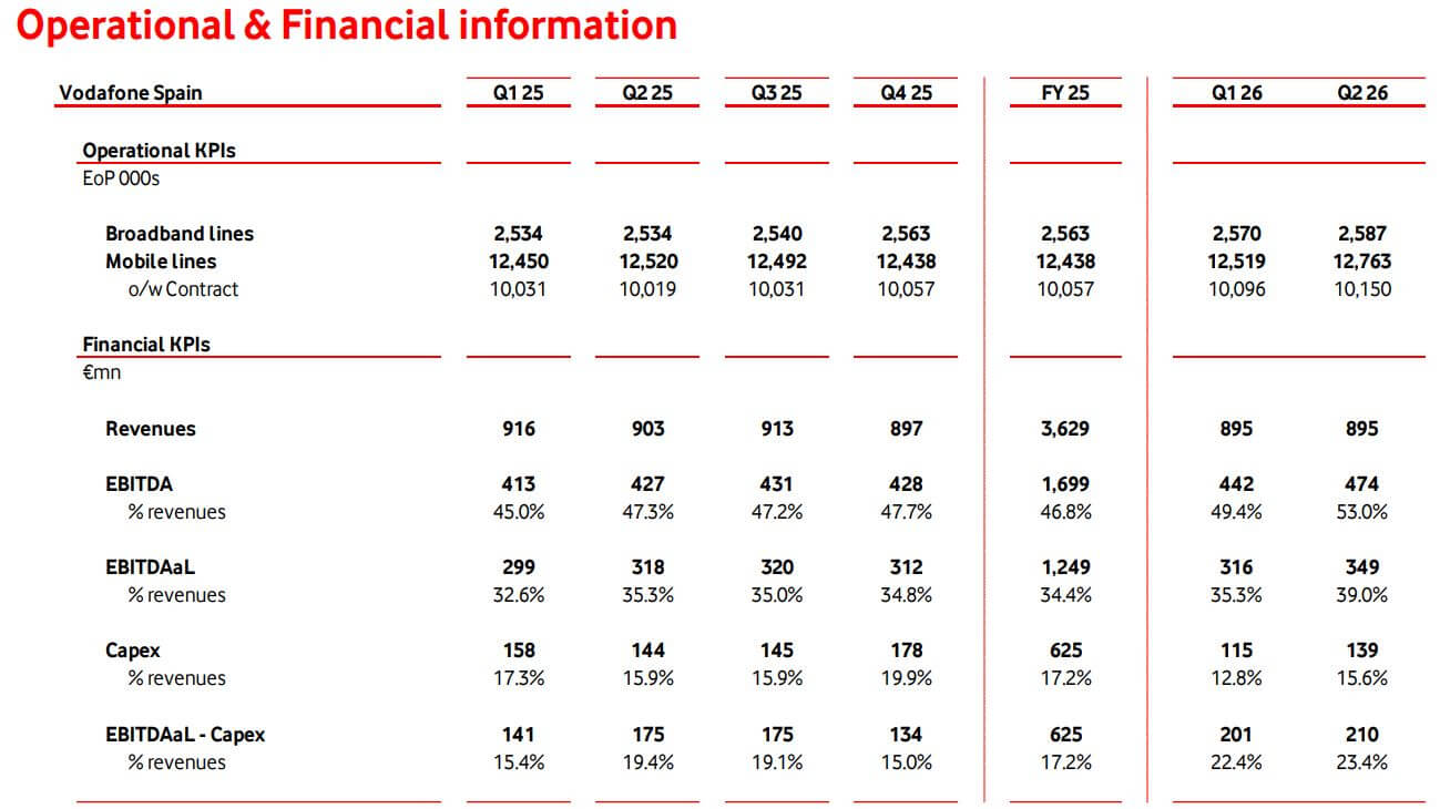 También destacar que Vodafone España ha mejorado su flujo de caja y su actividad comercial en esta primera mitad del año. En concreto, la base de clientes se incrementó en los meses de verano en 71.000 clientes de móvil y fibra que se repartieron en 54.000 nuevas líneas móviles de contrato, 17.000 altas de banda ancha fija y un aumento del 14% en las ventas de paquetes convergentes.
