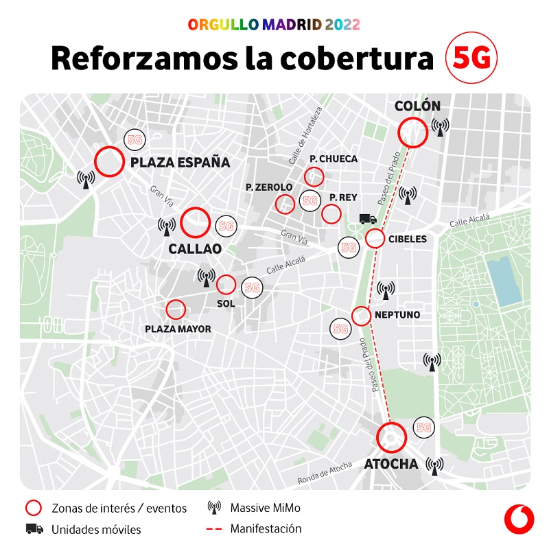 Vodafone hará uso de la tecnología Massive MIMO en los principales puntos estratégicos y a lo largo de todo el recorrido de la manifestación, que comprende desde la Glorieta de Atocha a la Plaza Colón, pasando por las Plazas de Neptuno y de Cibeles.