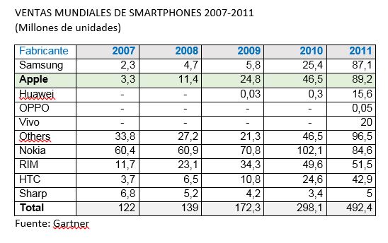 • Ventas mundiales de smartphones 2007-2011. Fuente Gartner