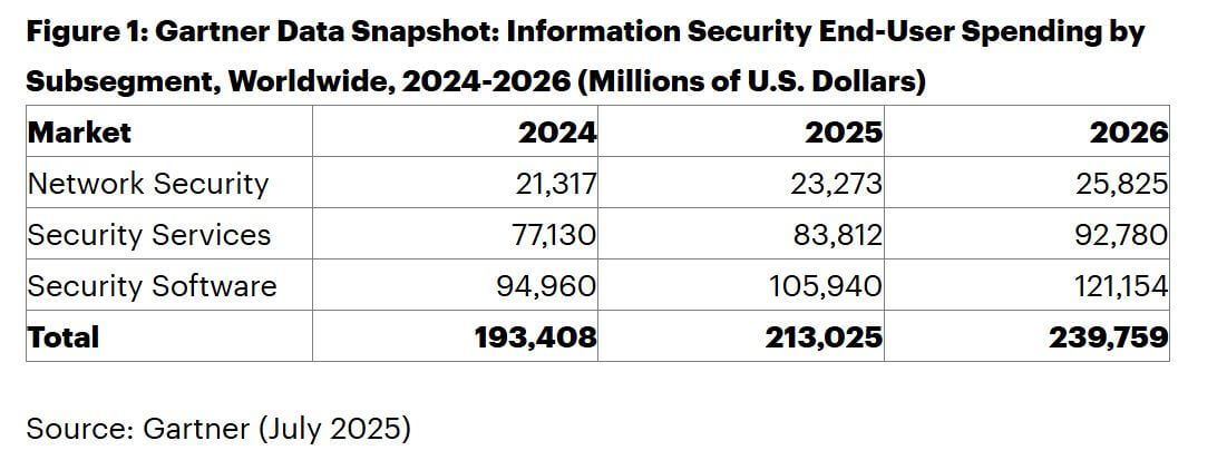 Se prevé que el gasto mundial de los usuarios en seguridad de la información alcance los 213.000 millones de dólares en 2025, frente a los 193.000 millones registrados en 2024. Así lo estima Gartner. Según la consultora, esta partida presupuestaria aumentará un 12,5% en 2026 llegando a los 240.000 millones de dólares.